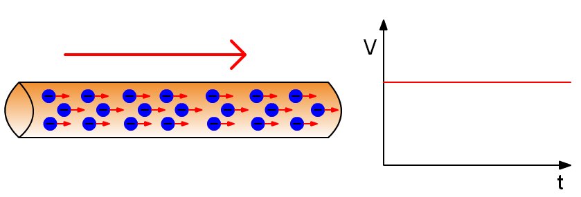 La corriente continua (CC en español, en inglés DC, de Direct Current) se genera a partir de un flujo continuo de electrones (cargas negativas) siempre en el mismo sentido, es decir que siempre tiene el mismo valor