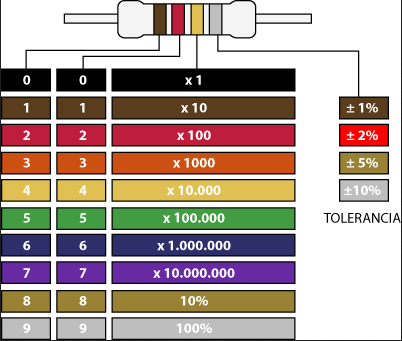 El primer color representa la primera cifra, el segundo color representa la segunda cifra y el tercer color la potencia de 10. El cuarto color indica la tolerancia, por ejemplo dorado ±5%