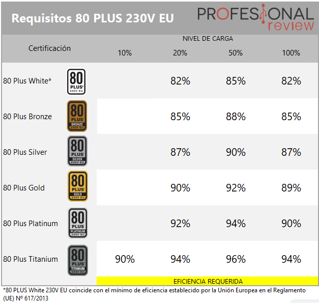 Actualmente, existen 6 tipos de Certificaciones 80 Plus: Estándar, Bronce, Plata, Oro, Platino y Titanio. Una fuente de alimentación es probada para comprobar su eficiencia al 10%, 20%, 50% y 100% de carga.