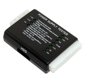 Este comprobador testea las salidas de voltaje de su fuente de alimentación ATX con conexión a placa base de 20 o 24 pines, la toma de alimentación SATA, Disco Duro-Unidad Óptica Molex, o de Disquete. En el caso de que no tengamos un comprobador de la fuente de alimentación, veremos en laboratorio como chequear las fuentes de alimentación con un voltímetro.
