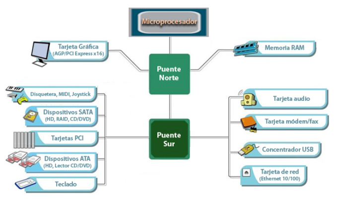 Los circuitos integrados más destacados por su funcionalidad se denominaban puente Norte (NorthBridge) y puente Sur (SouthBridge). Para Intel el puente norte sería memory controller hub (MCH) y el puente Sur I/O Controller Hub (ICH). Intel antiguamente unieron el puente Norte y el Sur, por un bus muy rápido llamado FBS (Front Side Bus), que posteriormente evoluciono en el QPI (QuickPath Interconnect), actualmente ha desaparecido dado que el puente Norte se ha integrando dentro del procesador. El bus que comunica el puerto Sur y el puente Norte en el caso de AMD se llama HyperTransport (HT).