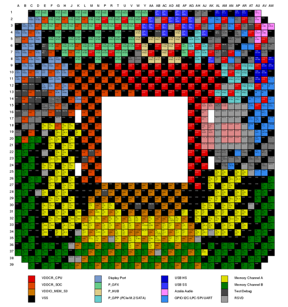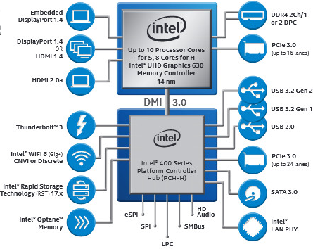 A la derecha un chipset de intel (i9 de 11th generación), como se puede ver el microprocesador se une por medio del DMI 3.0 x8 a 8 GT/s