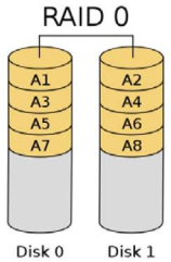 Denominado configuración en bandas (striping). Consiste en almacenar datos distribuyéndolos en todas las unidades. Es utilizado para fusionar todos los discos duros en un sólo disco para aumentar la capacidad de almacenamiento y el rendimiento. Disminuye la fiabilidad.