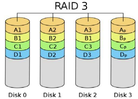 (Striping + paridad). Denominado conjunto de discos con datos entrelazados en bits. Divide los datos a nivel de bytes en lugar de a nivel de bloques . Los discos son sincronizados por la controladora para funcionar al unísono. Éste es el único nivel RAID original que actualmente no se usa. Permite tasas de transferencias extremadamente altas.